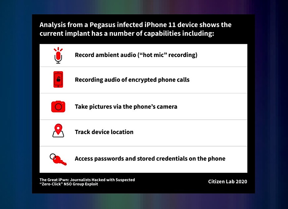 NSOは、政府や民族国家を相手にスパイウェアPegasusをパッケージ済みサービス(VICE記事)として販売しており、顧客のターゲットにスパイウェアを侵入させるために必要なインフラと脆弱性情報を提供している。しかしこのスパイウェアメーカーは、顧客が何をしているかに関して再三自らを遠ざけ、顧客のターゲットが何であるかは知らないといっている。NOSの顧客として知られている中には独裁政権も含まれている。サウジアラビアはこの監視技術を利用して、コラムニストのJamal Khashoggi(ジャマル・カショギ)氏(NYTimes記事)を同氏の殺害直前に偵察していたと見られている。米国諜報機関は同国の事実上の支配者である、Mohammed bin Salman(ムハンマド・ビン・サルマーン)ン皇太子の命令である可能性が高い(WaPo記事)と結論を下した。