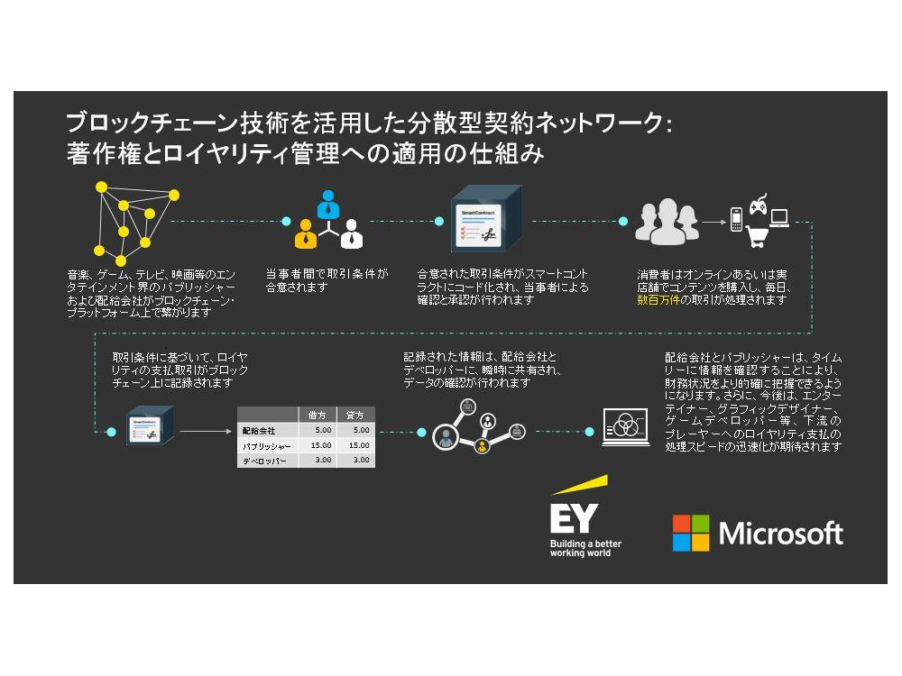 同ブロックチェーンプラットフォームに関しマイクロソフトは、ゲームブランド「Xbox」のパートナー、アーティスト、ミュージシャン、ライター、その他コンテンツクリエーターのネットワーク向けに、ロイヤリティ契約の締結から支払・照合までを網羅する財務記録システムとして活用していく。EYは、契約関連の計算や取引処理を自動化できるようサポートする。