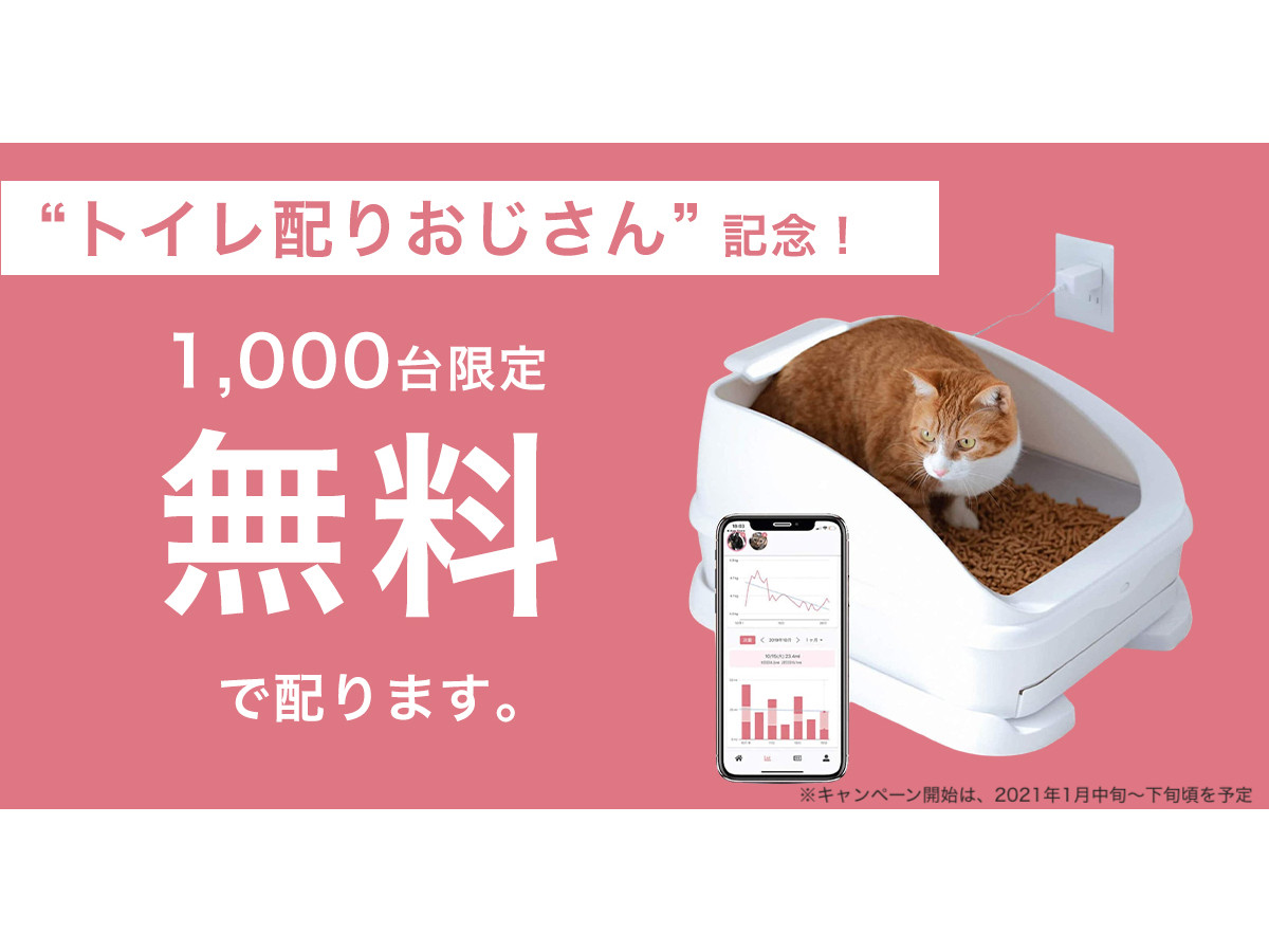 同社は、今回の出資を記念し、ねこのトイレチェックと健康管理がスマホで行えるスマートトイレ「toletta」(トレッタ)を抽選で1000台無料配布するキャンペーンを実施すると明らかにした。キャンペーンの開始は、2021年1月中旬〜下旬頃を予定。キャンペーン開始は、トレッタ公式Twitterより告知する。