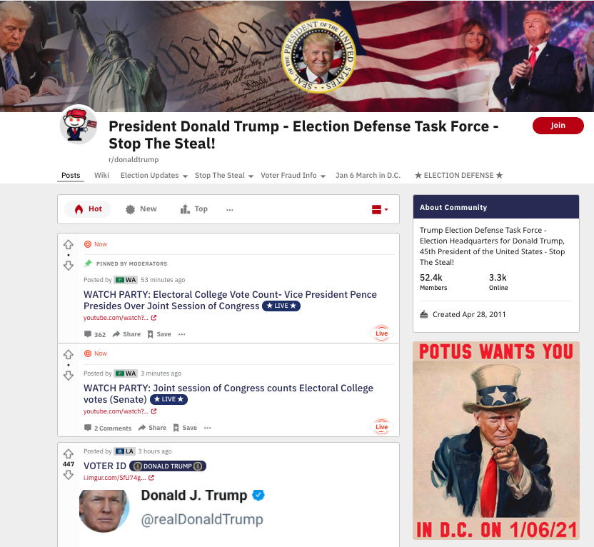 r/donaldtrumpは他のいくつかの親トランプ派のサブレディットほどは悪名高くなかったが、一方でStop the Steal運動の現在の拠点となっていた。このサブレッドディットはまた、米議会議事堂での凶悪な暴力に発展したワシントンD.C.のデモへの参加を奨励していた。またr/donaldtrumpのサイドバナーには、Uncle Sam(アンクル・サム)に扮したトランプ大統領の画像が掲載されていた。そこには、「POTUS wants you in D.C. on 1/06/21」と書かれている。