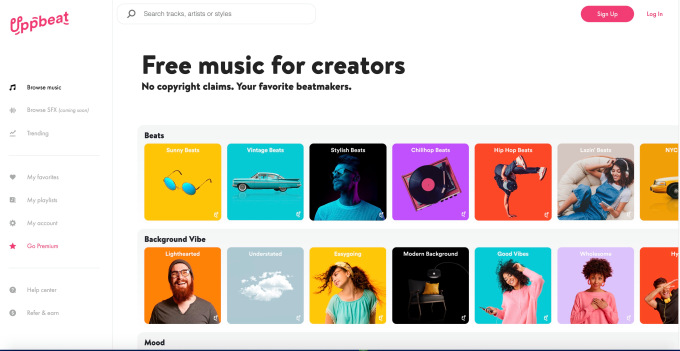 Uppbeatのカタログも見やすい構成だ。音楽がジャンル別、テーマ別、スタイル別に整理されていて、YouTuberが必要とする音楽やビートの種類を示すカラフルな列の中に配置されている。たとえばバックグラウンドで使用するためにカスタマイズされた音楽や、inspiring(インスピレーションを与える)、calm(穏やかな)、happy(楽しい)、dramatic(ドラマチック)といった、さまざまな雰囲気に対応するトラックが用意されている。数カ月後にはSFX(効果音)のカタログも追加される予定だ。