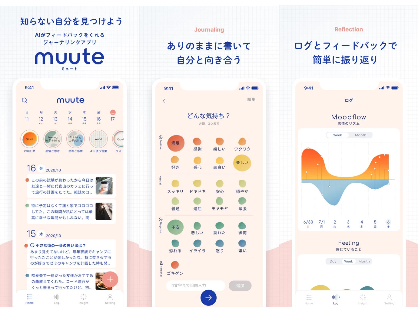muuteは、感じたことや思ったことを日記のように自由に書き出し、自分の感情と思考を振り返ることで新しい自分を発見するための「ジャーナリングアプリ」。