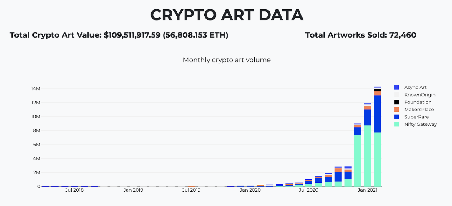 crypto art(クリプトアート)の推定価値が累計1億ドル(約107億円)を超えたことをcryptoart.io/dataは示している。これは成長を続けるNFTエコシステムの一分野にすぎない。