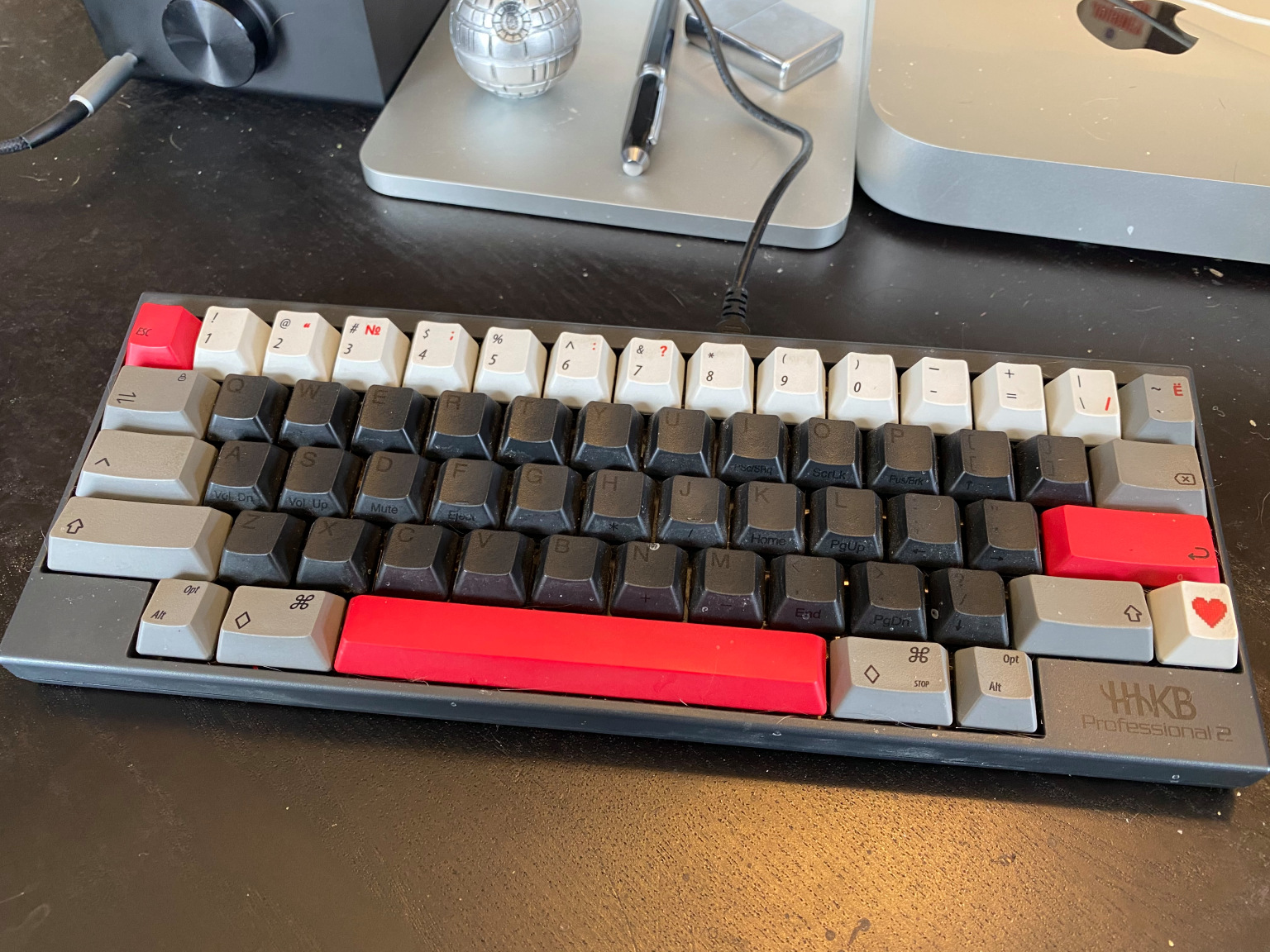 これはHappy Hacking Keyboard Professional 2(ハッピーハッキングキーボード・プロフェッショナル2)with a partial set of custom keycaps。そう、小さなキーボードにしては長い名前だ。完璧ではないが、大のお気に入りだ。ご心配なく、テンキーとメディアコントロールもある。ファンクションキー(これがキモ)経由で利用する。