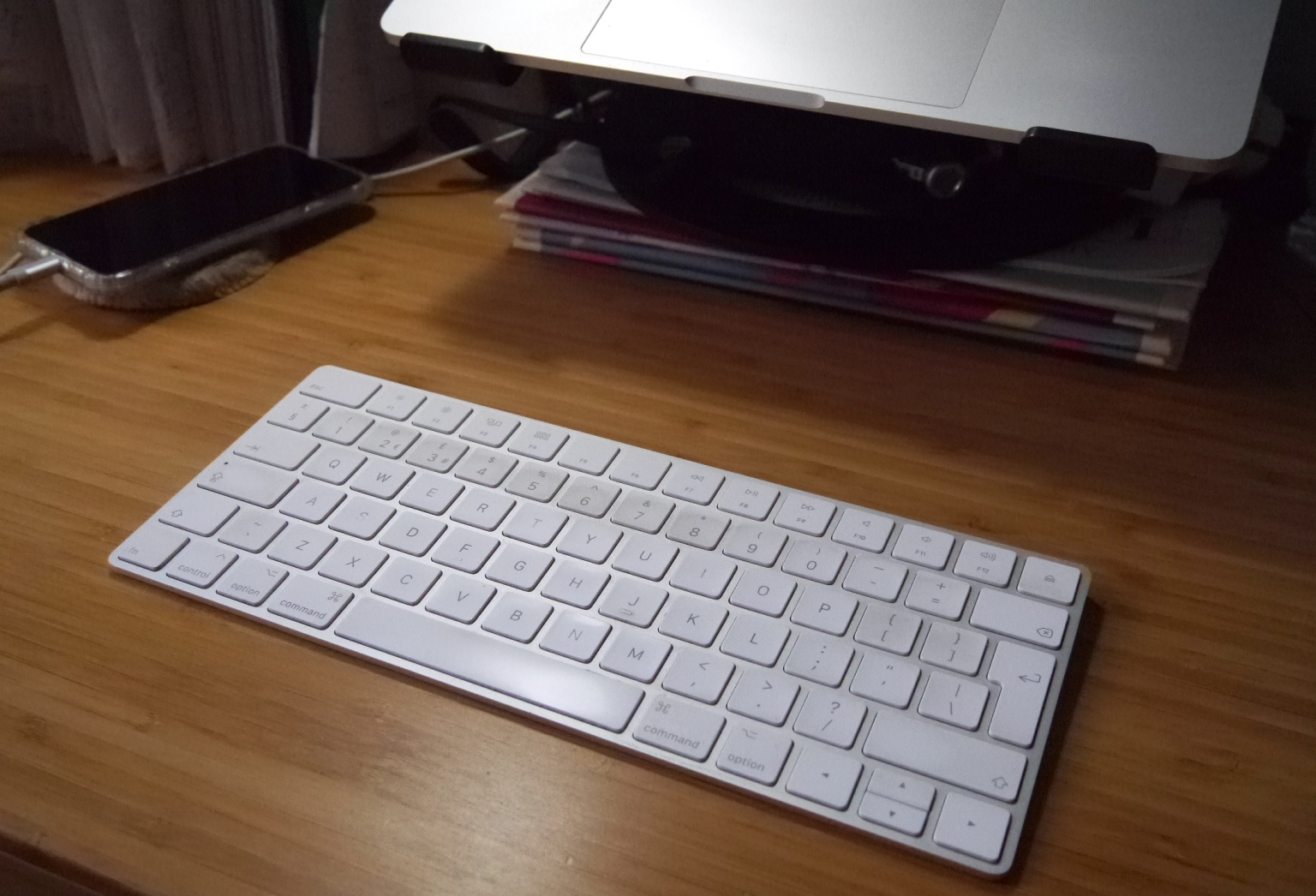 仕事で使っている道具について語ることはあまりない……。きれいに掃除していることを除いては。白さは今となってはAppleの望む鮮明さではない。「S」キーの刻字はある理由により少々すり減っている。それ以外、不満はない。私はMBP(MacBook Pro)ノートパソコンのキーボードに依存するのを止めなくてはならなかった。なぜなら欠陥がひどかったからだ(「B」と「N」のキーが効かなかったり、2重にタイプされたりとキーボードルーレットのようだった)。バッテリも十分長持ちする。充電するにはAppleの高すぎるアダプターを探す必要があるが。