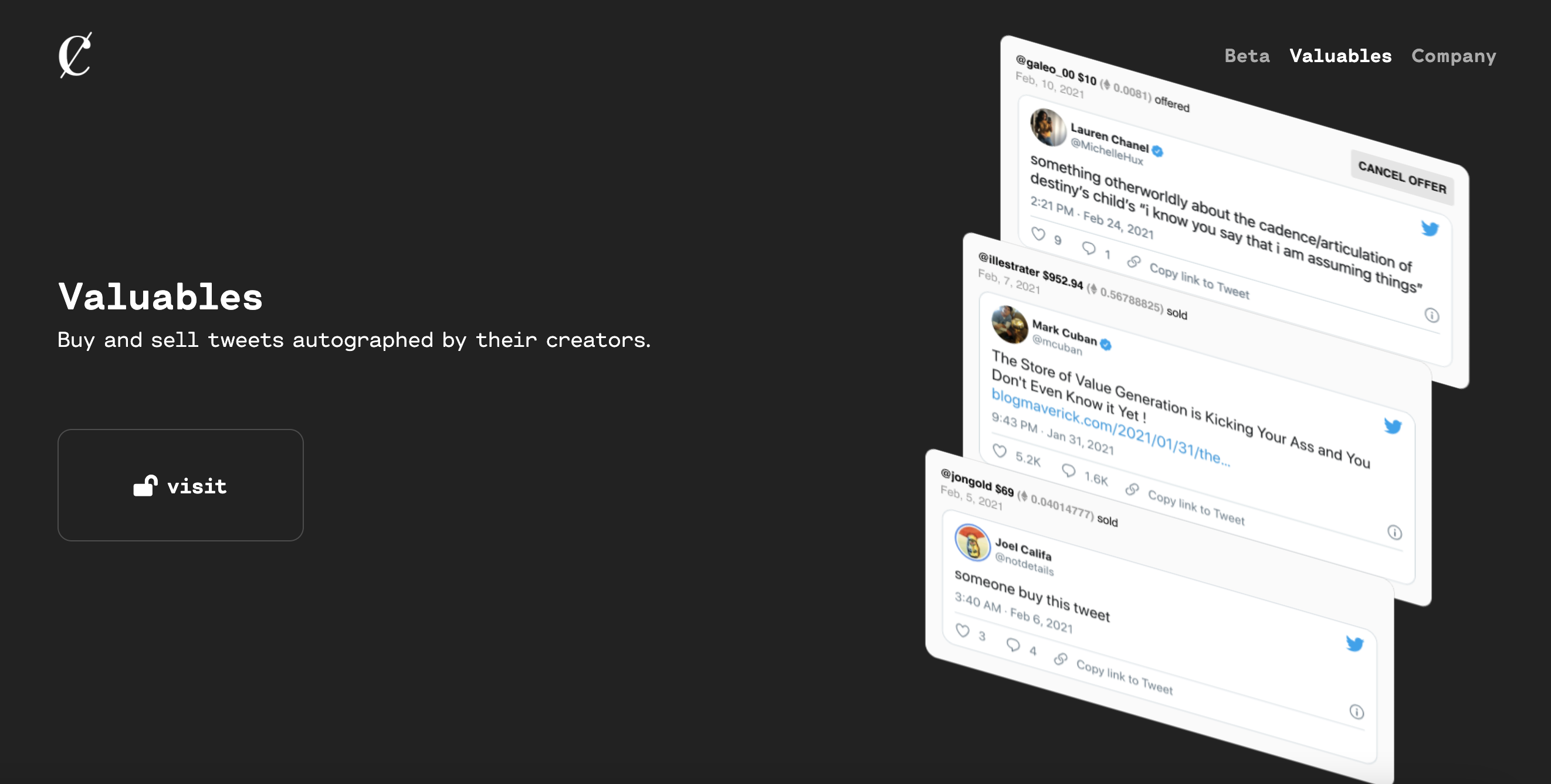 ツイートをNFTにすることで、自分のこれまでのツイートを、3億円とはいわずとも、いくらかで売ったり、好きなツイートを買ってコレクションにしたりできるようになる。なので今回、ドーシー氏がツイートの販売に使った、Cent運営のツイートNFTマーケットプレイス「Valuables」について紹介したい。