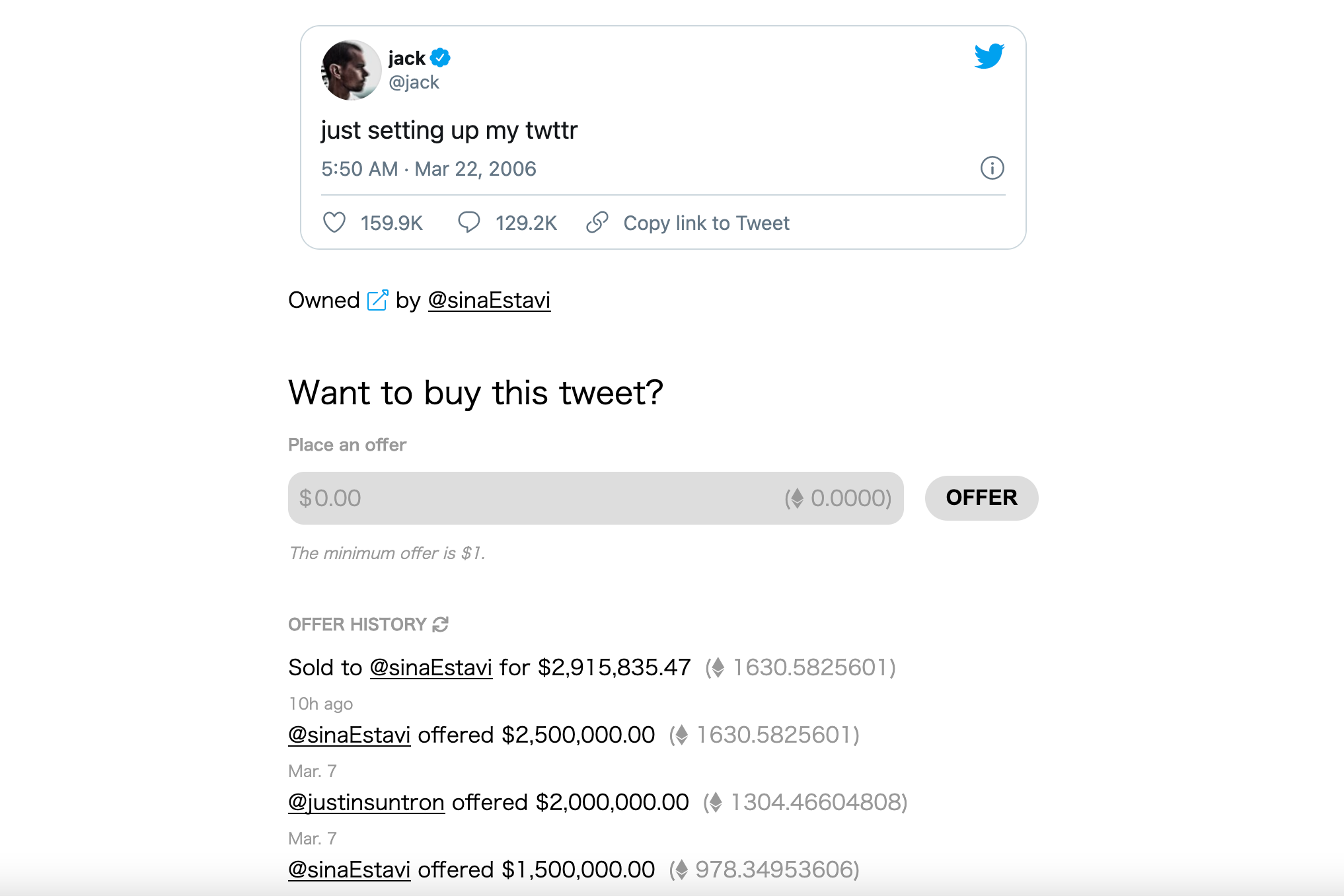 米国時間の2021年3月22日、Twitterの共同創設者でCEOを務めるJack Dorsey(ジャック・ドーシー)氏は最初のツイートのNFTをおよそ291万ドル(約3億1500万円)で販売した。ドーシー氏のツイートによると、その後、販売で得た資金は非営利団体Give Directlyに寄付したという。