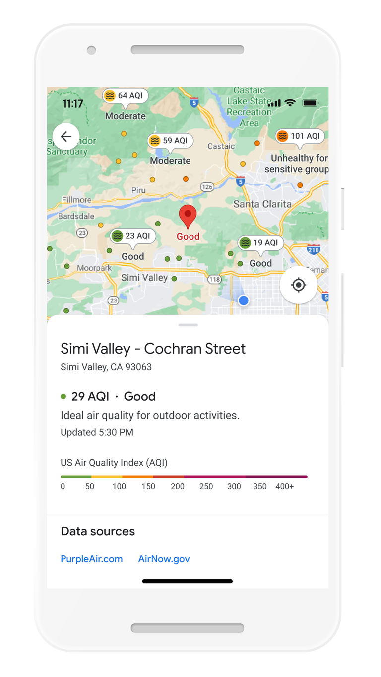 また、Googleマップには新たに気象データ(気象レーダーではない)と大気質のレイヤーが追加される。各地の天気を表示する気象レイヤーは今後数カ月のうちにAndroidとiOSでグローバルに利用可能になる予定だが、大気質レイヤーは、まずオーストラリア、インド、米国のみで導入される。