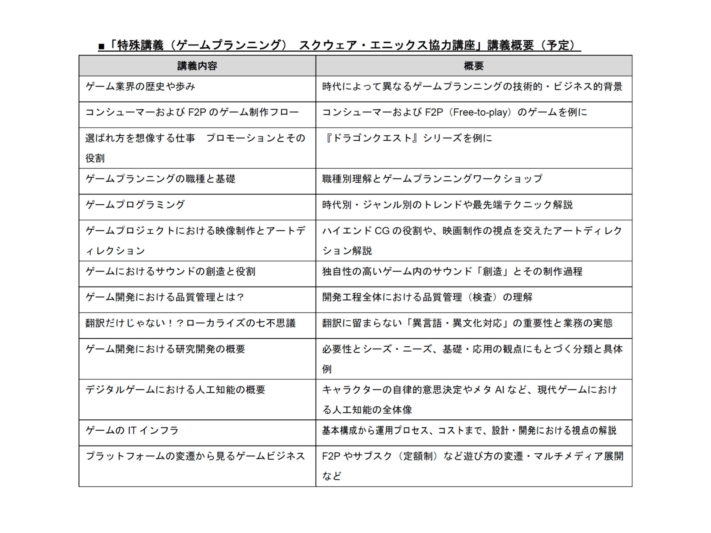 プログラミングやグラフィックスといったゲーム開発固有の専門知識だけでなく、ローカライズ(翻訳と異文化対応)や人工知能、映画制作の視点からみる映像ディレクションなど、バラエティに富んだ講義をスクウェア・エニックスの現役社員が13回にわたり展開する。