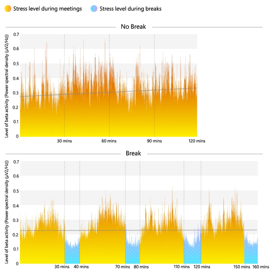 10分間の休憩を入れた日は、ストレスの数値が平均して低く保たれており、上昇を防ぐことができている。会議への積極的な関与を示す他の測定値も増加した。