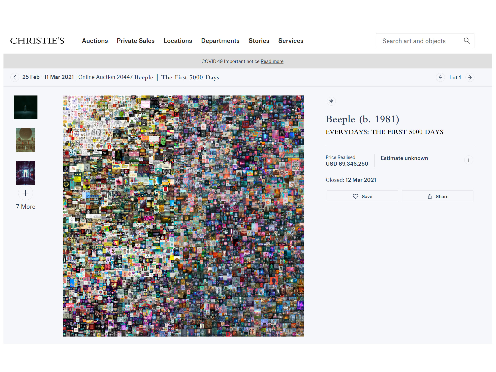 ・BeepleのNFT作品が75億円で落札、アート界に変革の兆し