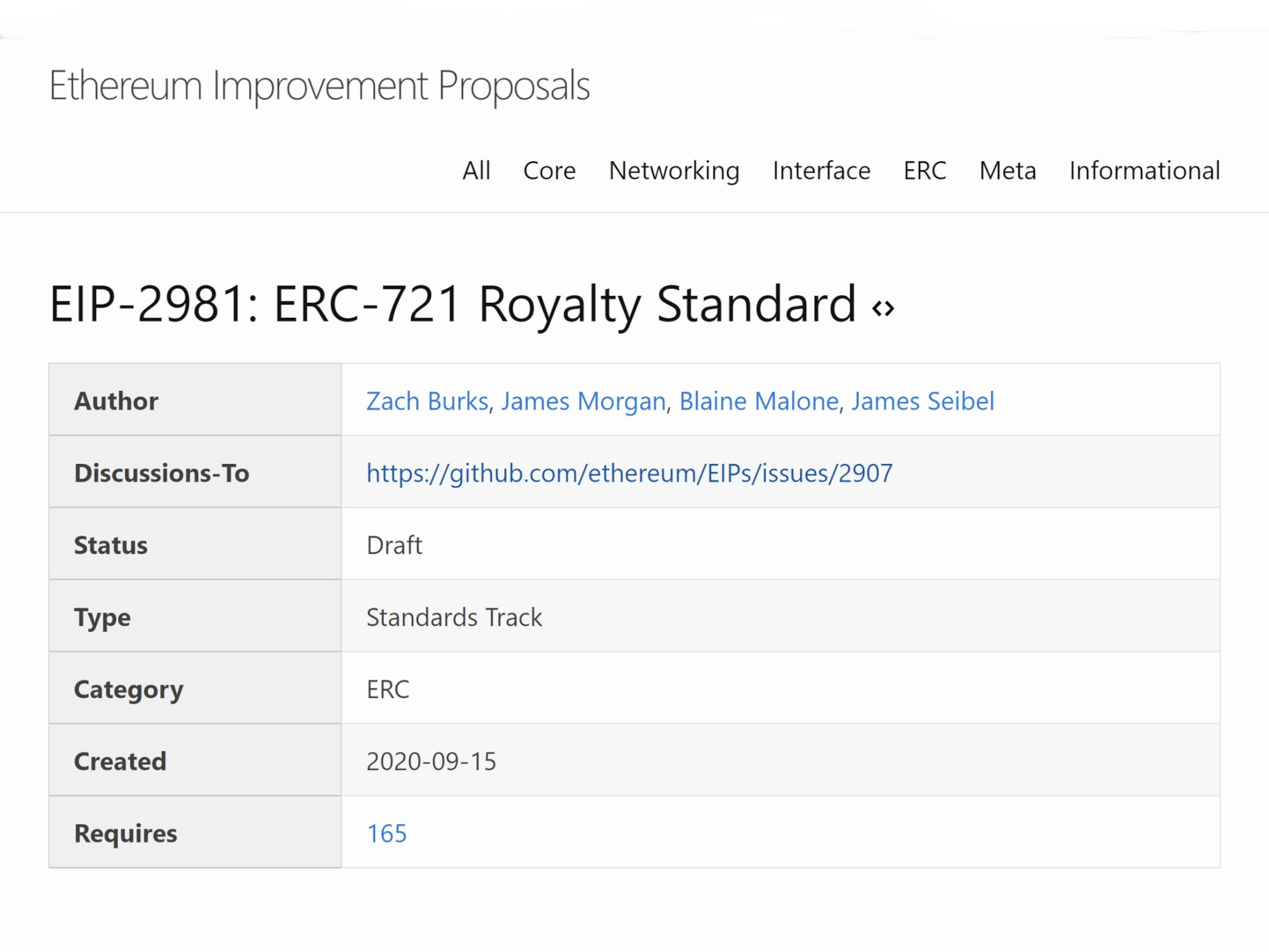 そうした状況を改善するために提案されたのがEthereum改善提案「EIP-2981」(ERC-721 Royalty Standard)です。この提案は、中古市場での取引でも制作者がロイヤリティを徴収できるよう、ERC-721を拡張するものです(2021年5月4日現在はドラフトの状態)。