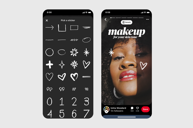 しかし、それでもアイデアピンには、ステッカーを追加したり「@ユーザー名」で他のクリエイターをタグ付けしたりするなど、ストーリーピンを共通の機能が数多く採用されている。Pinterestによると、まずは食べ物をテーマにしたイラストや、シーンの切り替え前後、季節感を表現したスタンプなど、Pinterestが期待するカテゴリーや行動に焦点を当てた、手描きのイラストの100種類以上のスタンプが用意される。