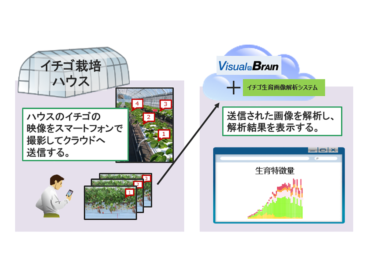 実証実験では、九州沖縄農業研究センター内のイチゴ品種「恋みのり」「さがほのか」の生育状況をスマートフォンで一定期間にわたり撮影し、解析に適した高精細かつ定点の画像データを収集。そしてイチゴ生育画像解析システムを使った画像解析で得られたデータを「VisualBrain」を通じてクラウドシステムに蓄積し、遠隔から現地の映像や解析結果を閲覧できる環境を構築した。