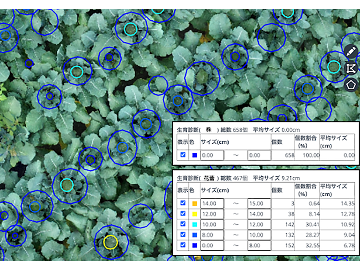 同機能では、AIが画像内の10〜15cm程度の花蕾を認識し、サイズ別に集計を実施。そして集計結果を確認することで、撮影時点の農地においてどの規格のブロッコリーが何%存在するのかを把握可能となる。ユーザーはドローンで農地の画像を撮影して「いろは」にアップロードするだけで、たった数時間で花蕾サイズ分布データが入手できるという。