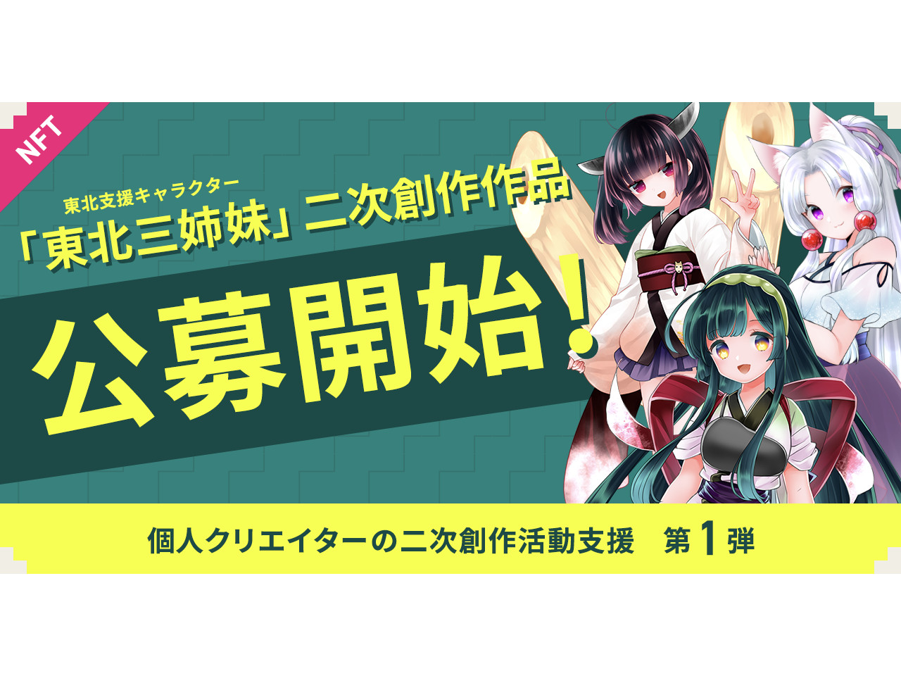 またその第1弾として、東北支援キャラクター「東北ずん子」「東北イタコ」「東北きりたん」の3姉妹をモチーフにした二次創作作品の公募受付を開始した。応募期限は2021年6月6日23時59分まで。二次創作イラスト・動画は新規作品(未公開作品)、過去に制作したものも対象としている。応募要項などの詳細を掲載している「東北ずん子NFT二次創作還元プロジェクト」より応募できる。