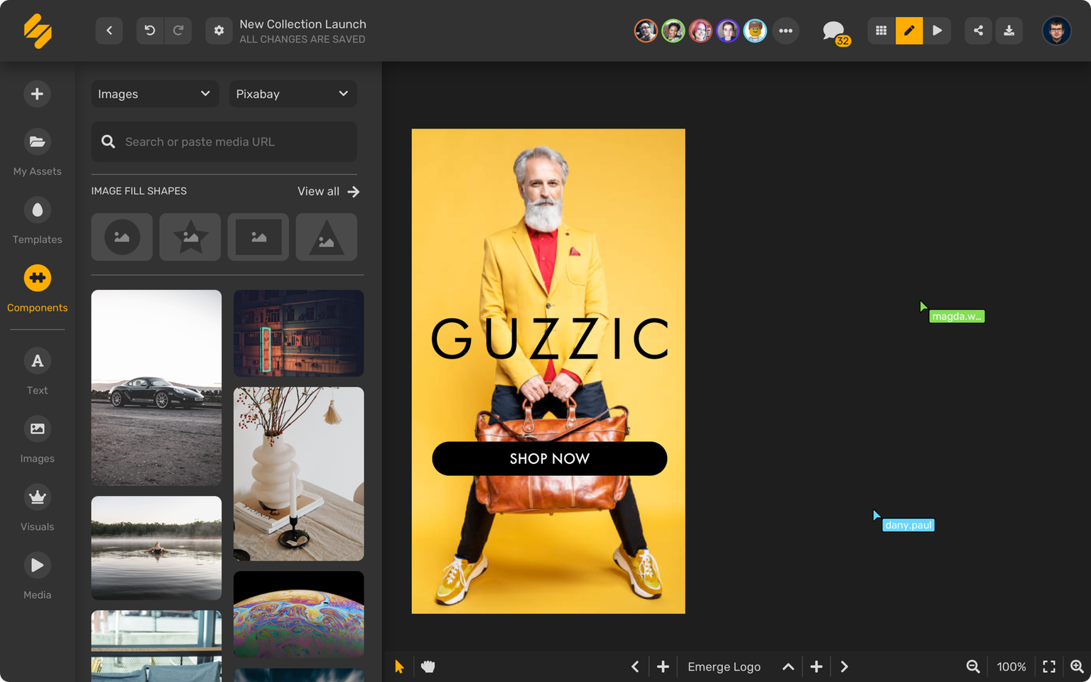 Simplifiedは組織全体で作品やアセットを共有する共同作業ツールも提供している。ストックフォトやストックビデオのサービスとも統合できる。