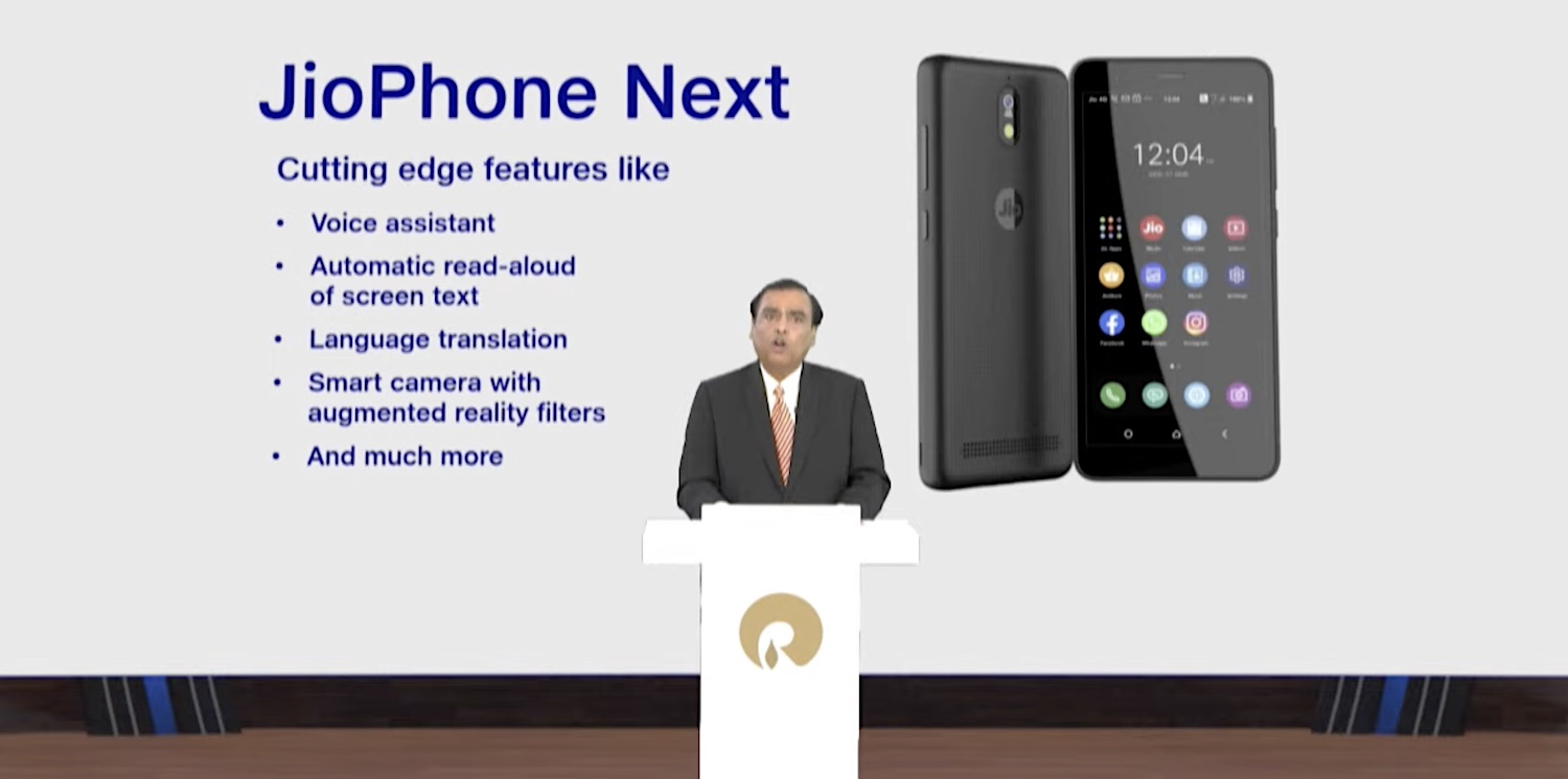 アンバニ氏によると、JioPhone Nextは「超低価格の4Gスマートフォン」になるとのことだが、端末の価格やハードウェアのスペックは明らかにされなかった。