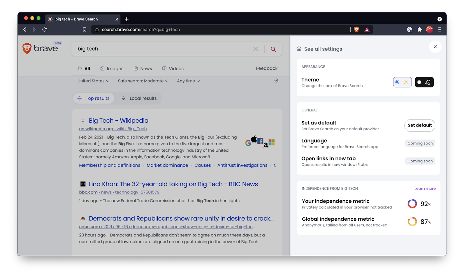Brave SearchはBraveブラウザのユーザーが選択できる複数の検索オプション(Google検索エンジンを含む)の1つとして提供されているが、Braveによると、2021年後半にはBraveブラウザのデフォルトの検索エンジンにする予定だという。