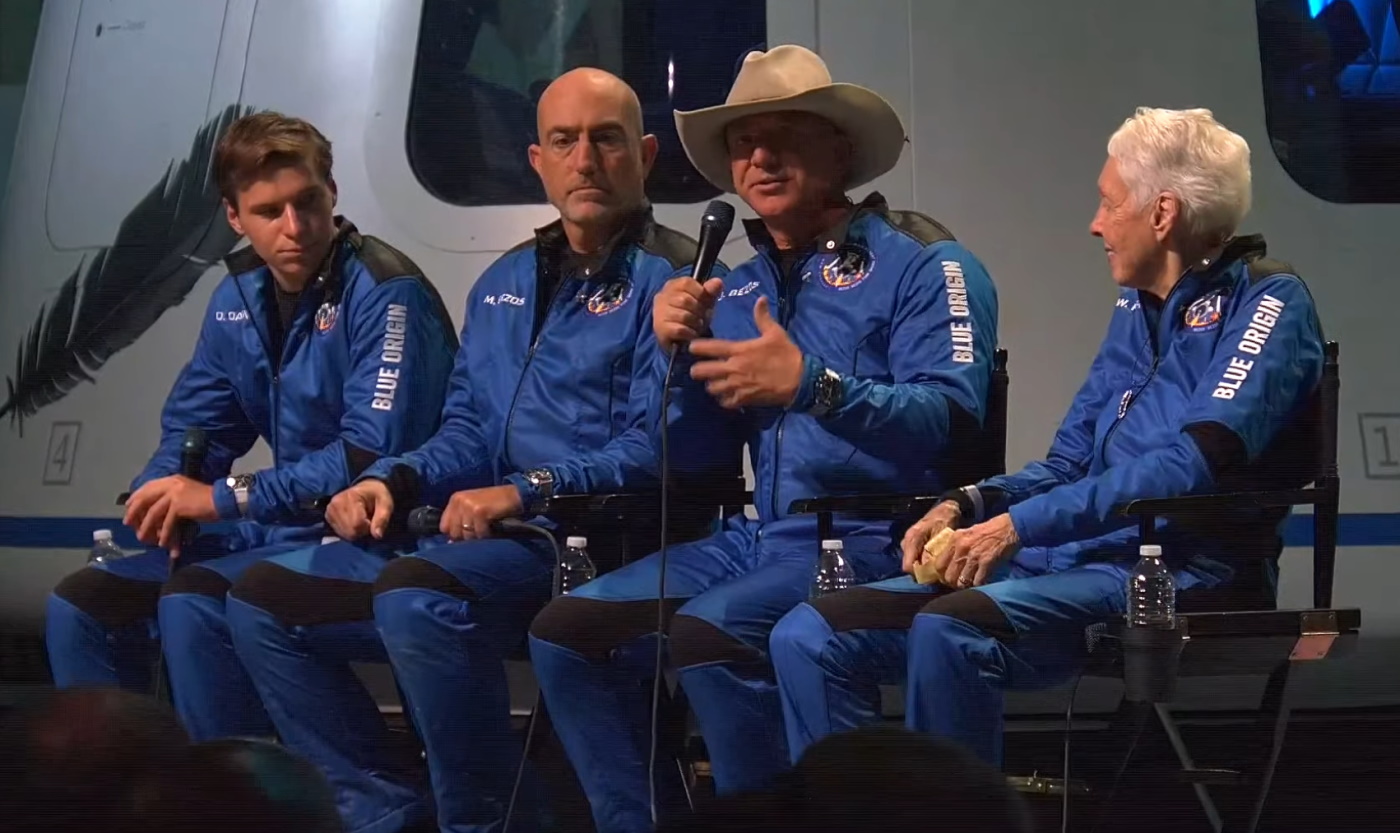 記者会見の冒頭で4人は、宇宙に行った人に与えられる伝統的なバッジである宇宙飛行士の「翼」をつけてもらい、にこやかな表情を浮かべていた。記者会見でベゾス氏は、カプセルから出てきたときと同じクリーム色のカウボーイハットをかぶり「とてもうれしいです」と語った。