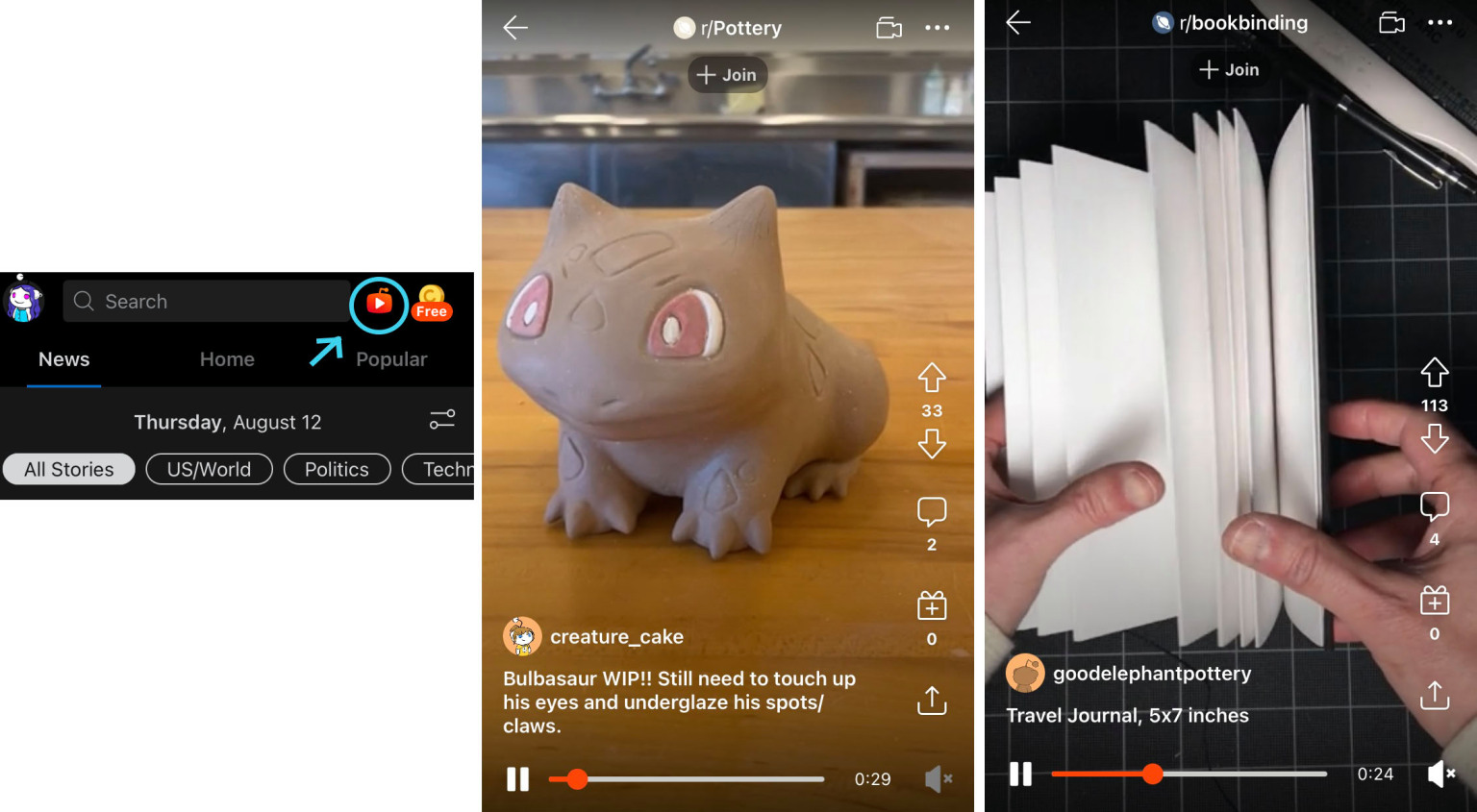 Redditによると、大半のiOSユーザーはアプリの検索バーの右側にボタンを目にするはずで、そのボタンをタップするとTikTokのようなコンフィギュレーションでビデオのストリームが表示される。ビデオが表示されると(ビデオをアップロードした人のポスターとサブレディットも表示する)、ユーザーは賛成票や反対票を投じたり、コメントしたり、賞をあげたり、はたまた共有したりすることができる。TikTok同様、ユーザーは上にスワイプして別のビデオやユーザーが購読しているサブレディットからのコンテンツ、関連するものを観ることができる。例えばあなたが r/printmakingを購読しているなら、r/potteryやr/bookbindingからのコンテンツを目にするかもしれない。