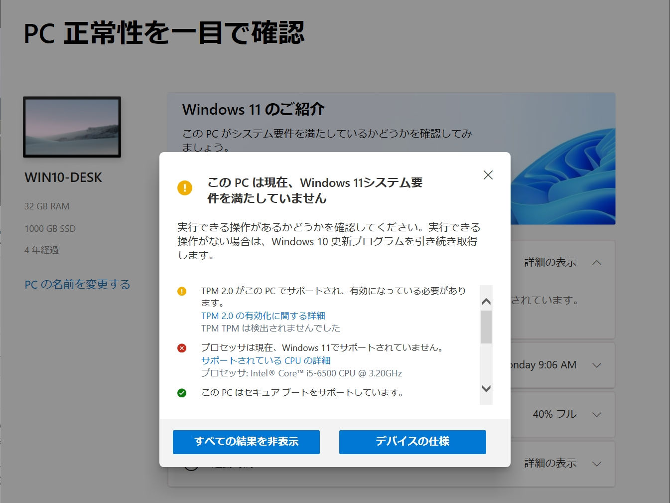 今回新たに公開されたPC 正常性チェックアプリアプリでは、以前のバージョンで問題となっていた「どの点が動作要件を満たしていないかがわかりにくい」という点を改善。上画像のように、「TPM 2.0(PCのセキュリティ管理機能)」をサポートしていない、あるいはプロセッサが対応モデルでない、などの詳細情報を提供してくれます。