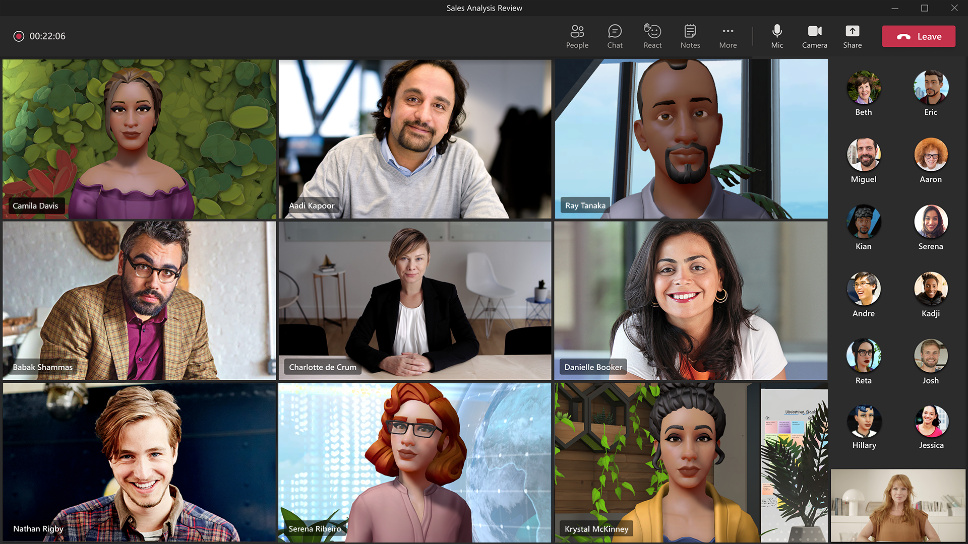 今のところ、ほとんどのユーザーにとって、Meshは3Dのパーソナライズされたアバターが本人のしゃべりを真似している以上のものではなく、動きもともわない。Microsoftによると、企業はTeams内に、独自のスペース(今、我々が使っている用語ならメタバース)を作ることもできて、そこでは人々がバーチャルに交わり協力できるということだ。