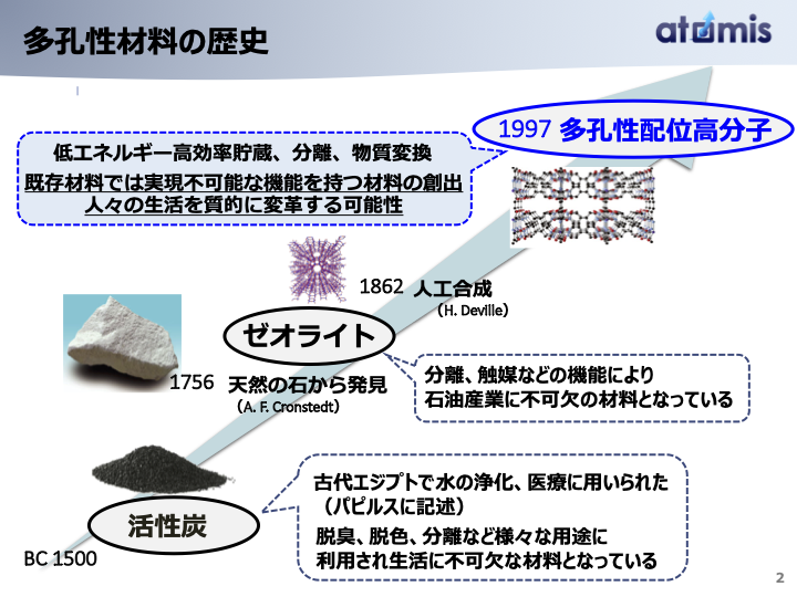 人間が紀元前から活用している多孔性材料には、現在も水の浄化や脱臭など、多様な用途で使われている活性炭がある。18世紀にゼオライトという多孔性材料が発見され、20世紀から活用されるようになり、石油産業で必要不可欠となった。