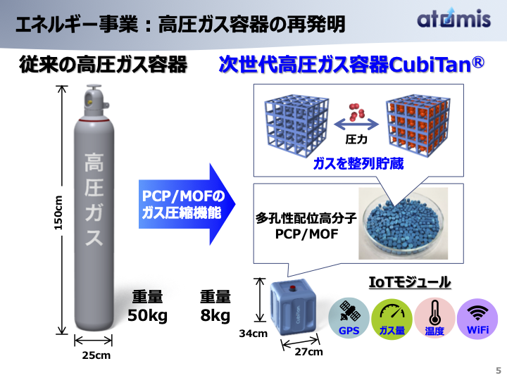 Atomisでは、MOFを使って次世代高圧ガス容器CubiTanを開発した。従来の高圧ガス容器は直径25cmの底に高さ150cm、重さ50kgで、ここ100年ほどイノベーションが起きておらず、同様の容器が使い続けられてきた。CubiTanはMOFの穴にガスを整列して並べることで効率的にガスを収納している。その結果、27cm×27cm×34cmのほぼ立方体型の容器となっている。さらに重さは8kg。軽量化にも成功した。さらに、CubiTanでは、IoTを活用してガスがどこにどれだけあるのかを把握することができ、遠隔管理できる。CubiTanは今後本格ビジネス化予定だ。
