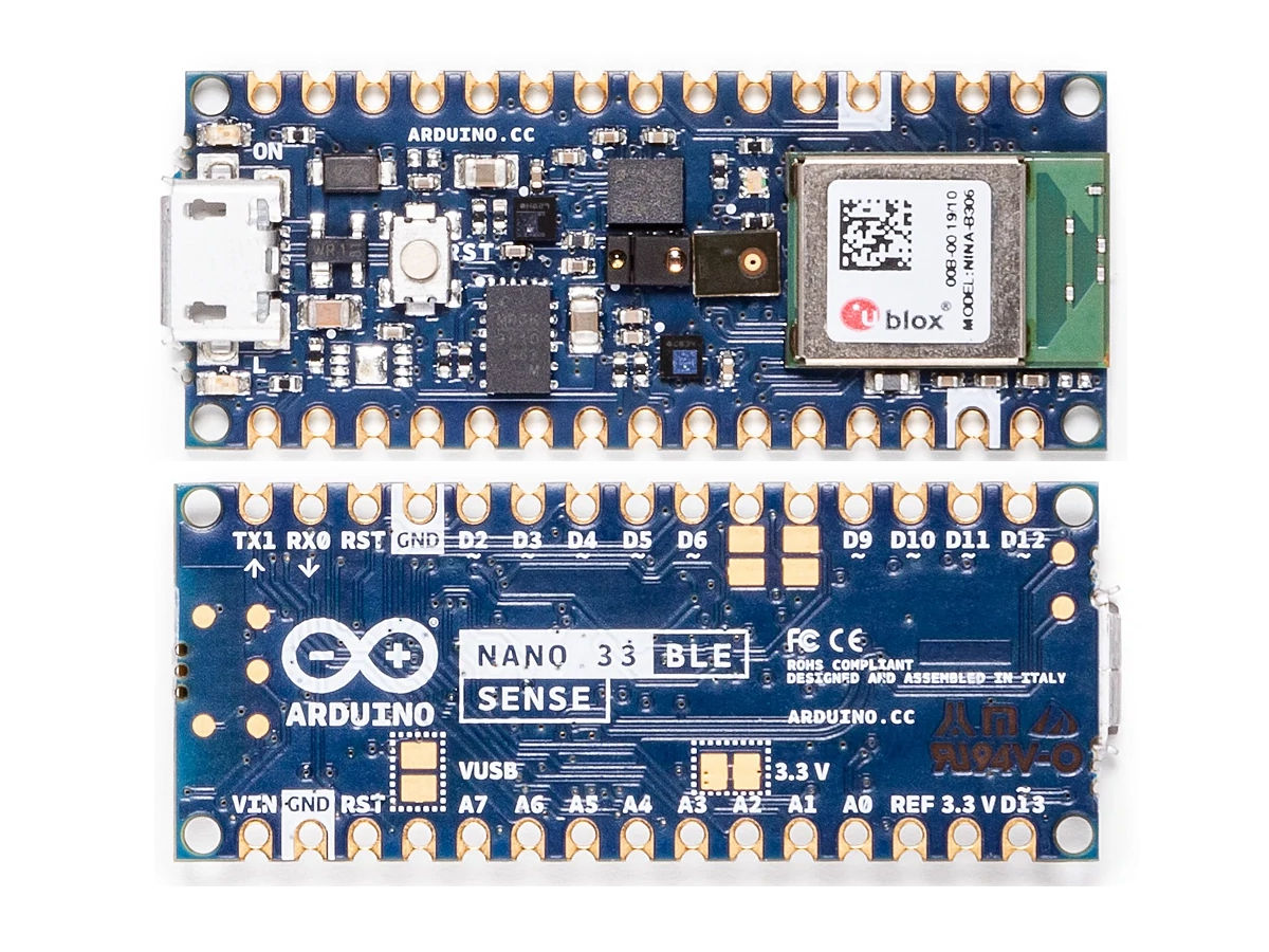 それぞれプロセッサーにはNordicのワイヤレスSoC「nRF52840」を採用。IMU(慣性計測装置)が搭載されているので、地磁気、ジャイロ、加速度計の合計9軸を測定できる。Arduino Nano 33 BLE Senseには、さらに温湿度センサー、気圧センサー、マイク、ジェスチャー、色センサーが搭載されている。
